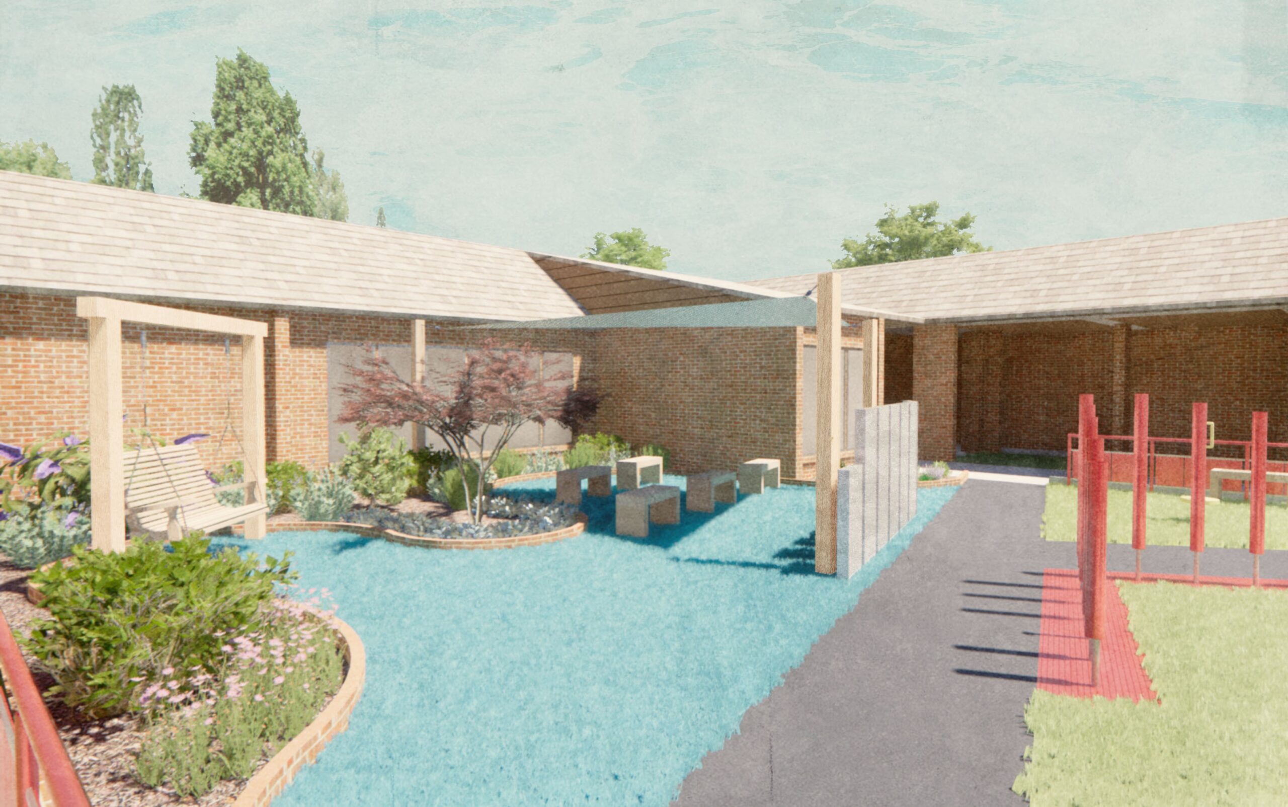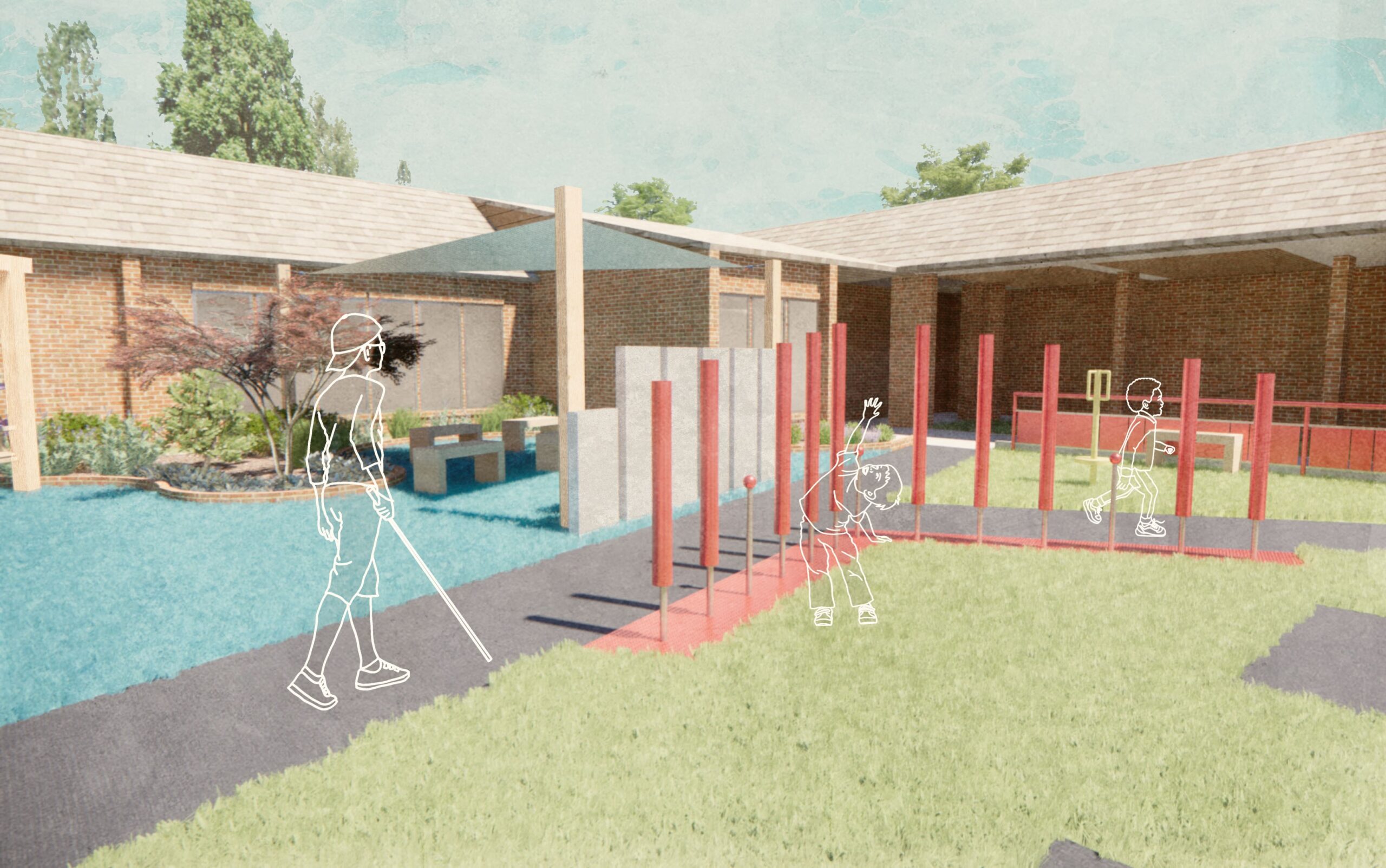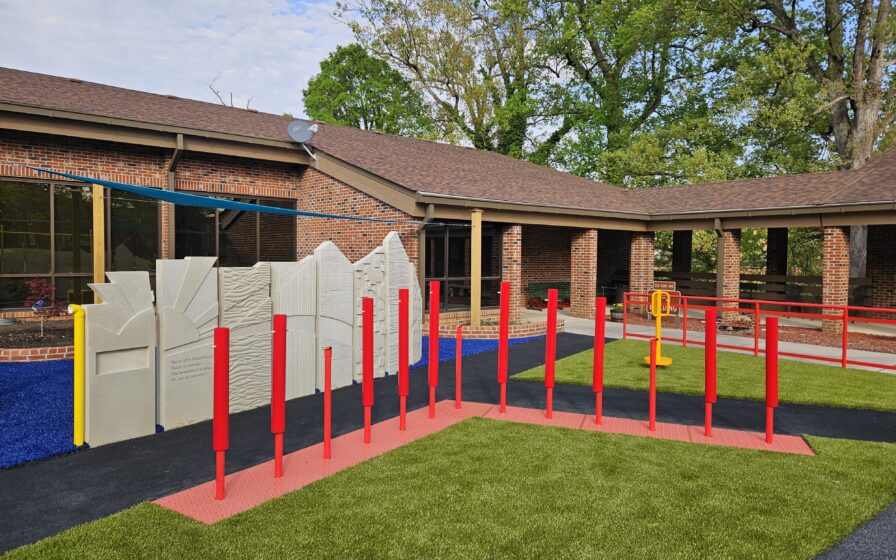 The finished space incorporates durable, low‑maintenance materials selected to support long‑term use while minimizing ongoing repairs for the school. Aromatic plantings, tactile surfaces, an herb garden, accessible seating, and auditory elements help reinforce orientation and sensory learning while contributing to a resilient and welcoming landscape.