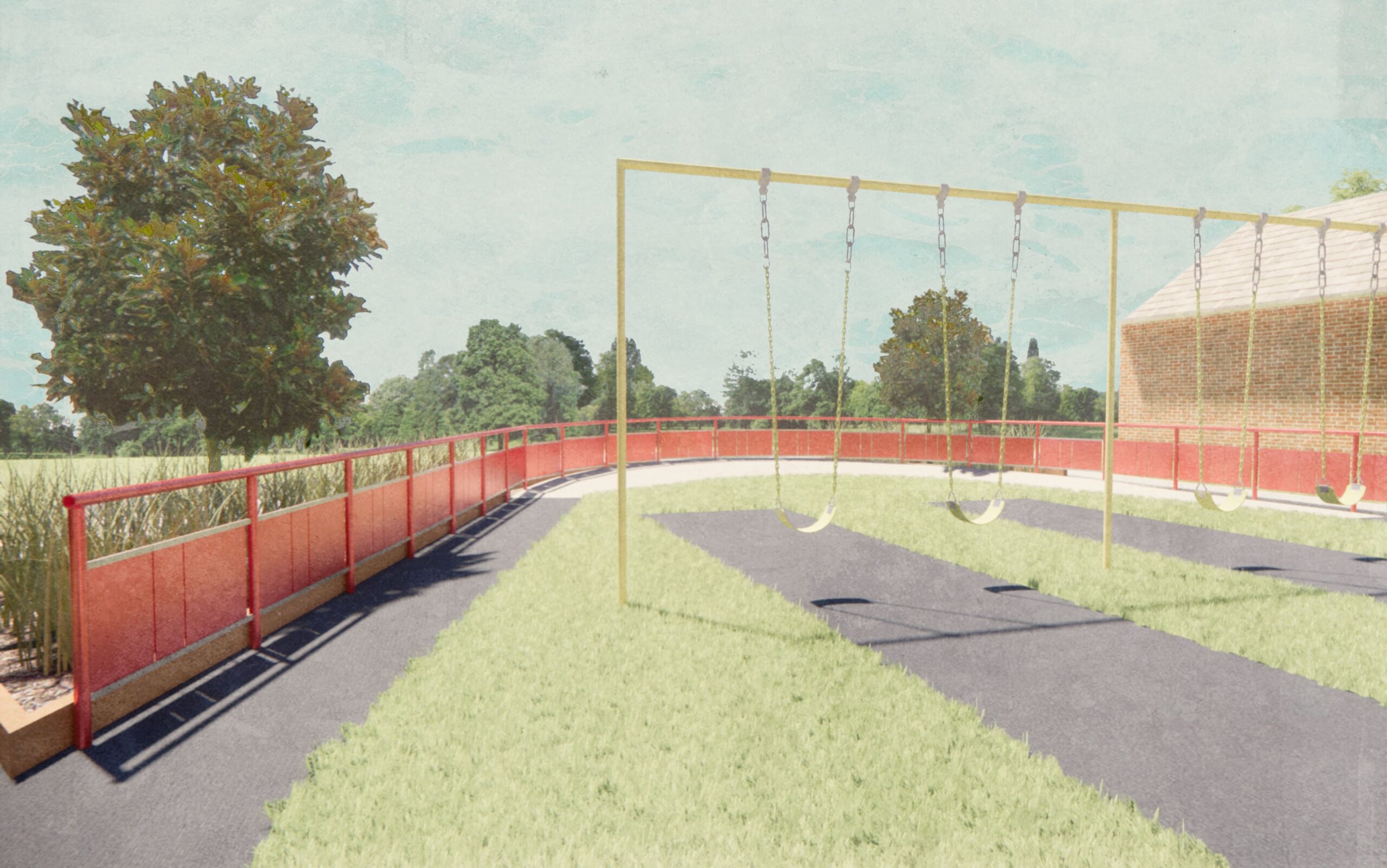 Blue and green turf materials were selected for their anti‑microbial and anti‑static properties to better support wheelchair users. Pour‑in‑place rubber was used along embankments and walkways, including cushioned fall zones beneath the swings. Whisper tubes were created from leftover PVC pipes from other projects, and the chimes were carefully tuned using metal pipes and tactile truncated domes commonly found at street crossings. New swings and a spin station were purchased to ensure safety and long‑term functionality.