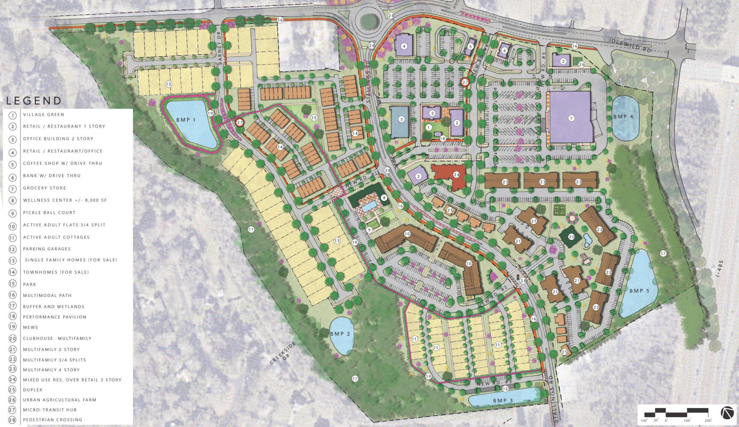 Santé Matthews is a 67-acre mixed-use community designed to support wellness, walkability, and long-term growth within the Town of Matthews’ Eastern Gateway Plan. Working with Pappas Properties, our team helped shape a 570-unit development that blends residential, retail, and shared spaces. The plan includes a village park, wellness center, urban agriculture, retail, and a range of housing types. Sustainability was a key focus, with strategies centered on reducing energy use, conserving water, and supporting responsible development.