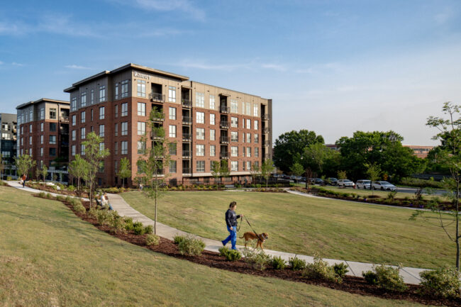The Ramsey is a 240-unit community designed to create moments of connection and pause within an urban setting. At the center of the project are three courtyards that support wellness, relaxation, and social interaction. The zen garden blends modern materials with natural elements to create a calm, reflective environment, including a meditation labyrinth, open turf for yoga, and quiet seating areas. The pool courtyard serves as a gathering space, anchored by a dual-sided firepit, outdoor cooking and dining areas, swings, and landscaped lounges. Together, these shared spaces help shape a community that feels balanced, intentional, and connected to its surroundings.