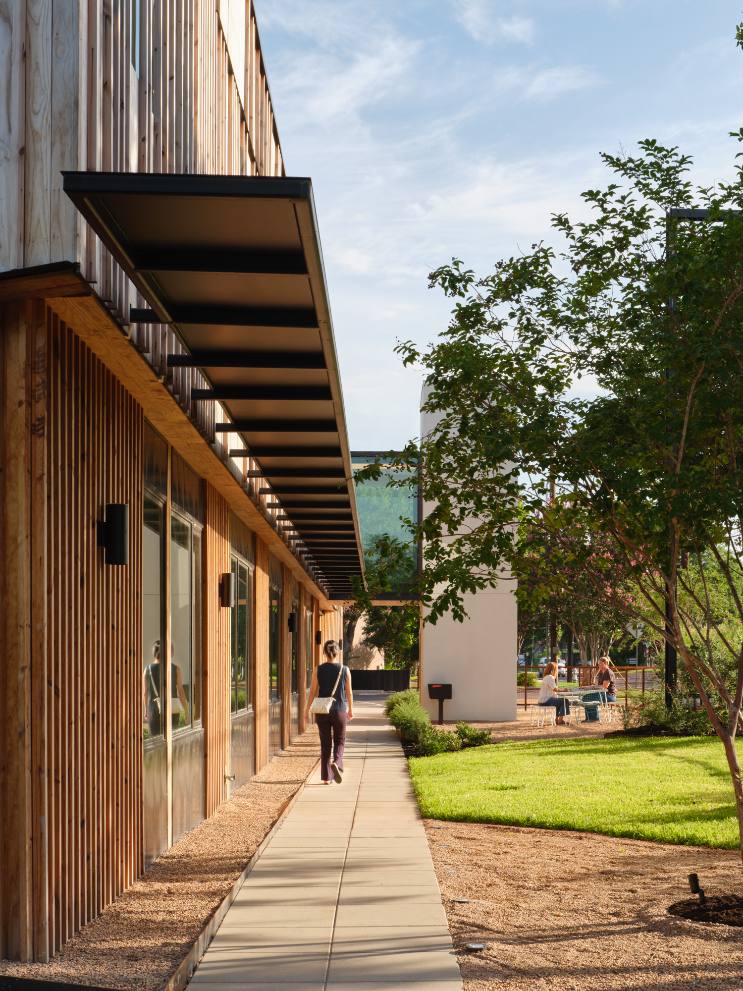 The existing front parking area at 4000 Medical Parkway was replaced with a green buffer, creating a welcoming “front yard” between the street and the building. This innovative design decision prioritizes wellness and sets a precedent for greenscapes in urban areas.