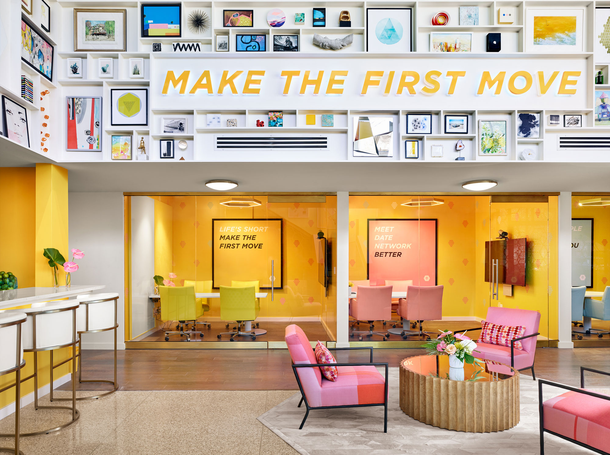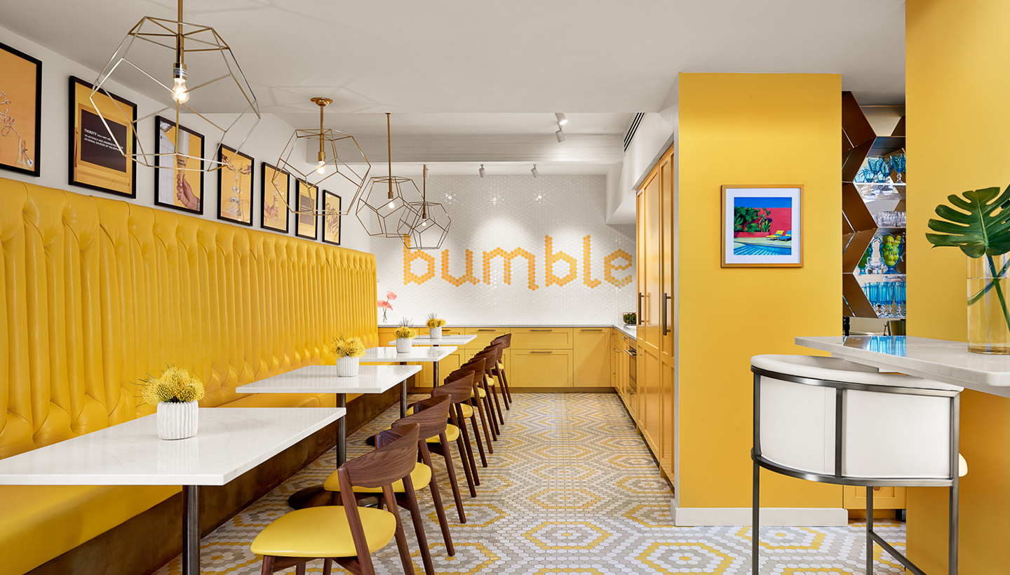 When Whitney Wolfe Herd and her team at Bumble were looking for an architect to make their vision come to life in the space, it was a natural fit, already knowing the space and proving he could think creatively to imagine a space like none other. Drawing inspiration from photos provided by Bumble and the interior design team at JEI Design, Inc., the architects made visions of hexagon wall coverings and a lifestyle-focused environment a reality.