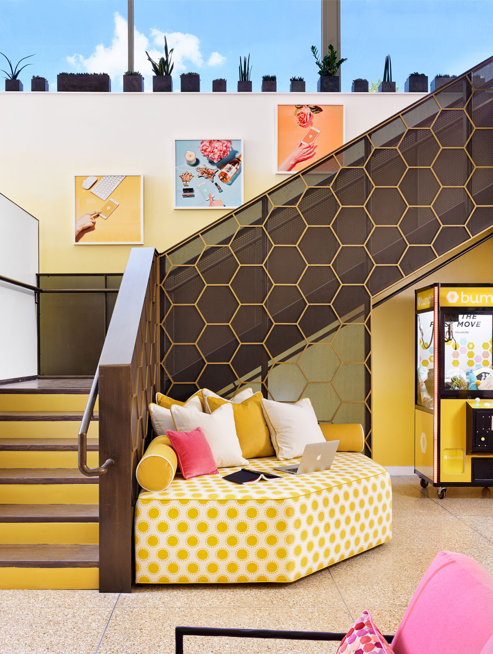 When Whitney Wolfe Herd and her team at Bumble were looking for an architect to make their vision come to life in the space, it was a natural fit, already knowing the space and proving he could think creatively to imagine a space like none other. Drawing inspiration from photos provided by Bumble and the interior design team at JEI Design, Inc., the architects made visions of hexagon wall coverings and a lifestyle-focused environment a reality.