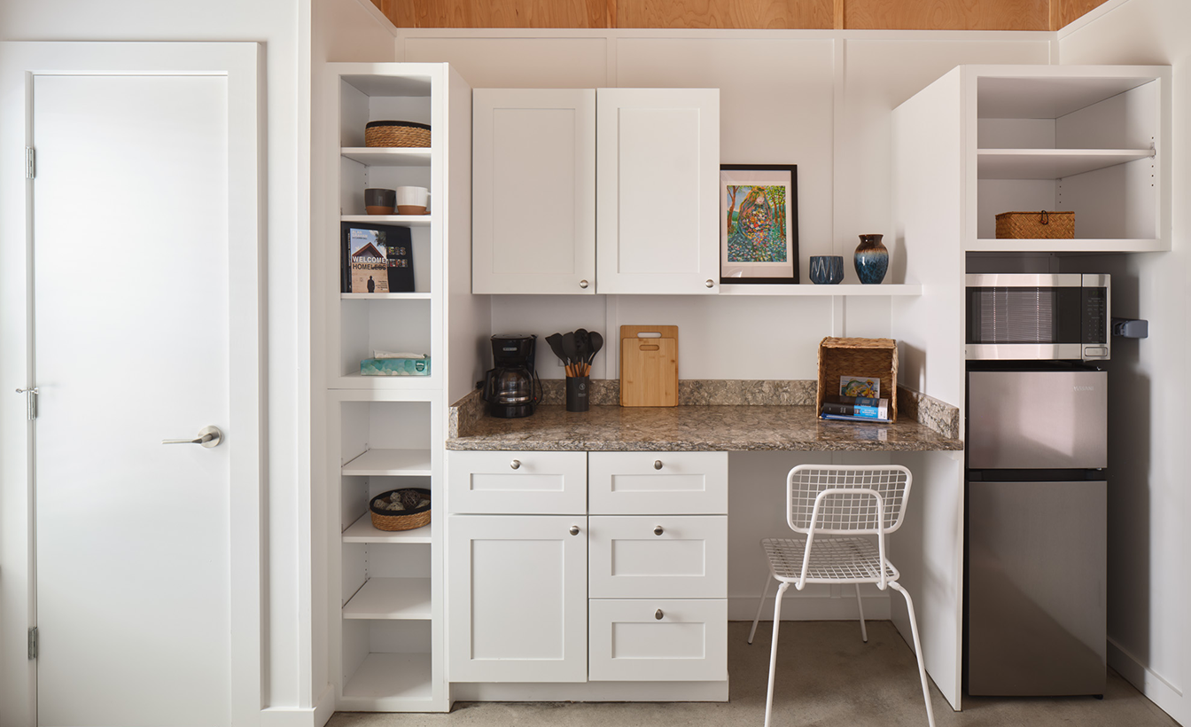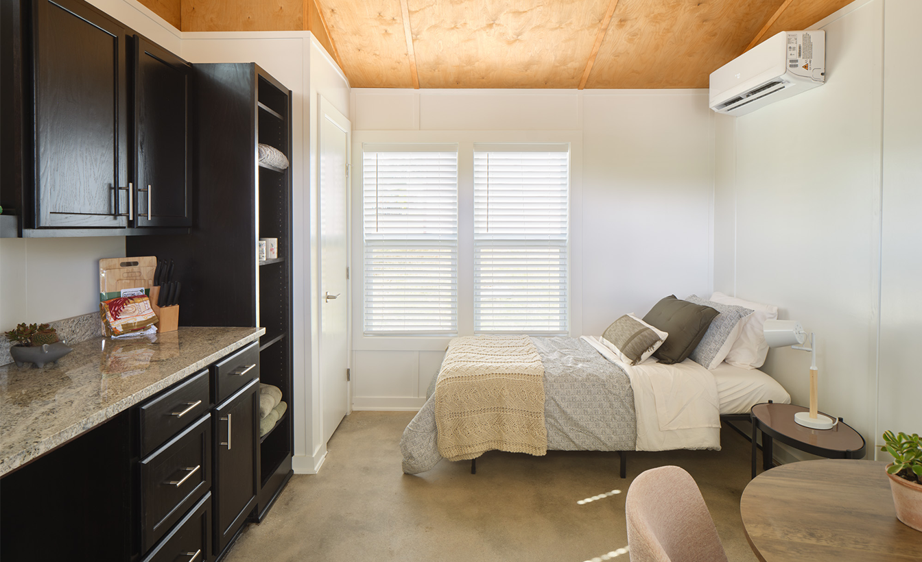 As part of this phase, we designed six custom microhomes ranging from 144 to 200 square feet. Each plan was intentionally crafted to reflect the personalities and living styles of future residents. Three layouts were created for more extroverted inhabitants — The Alcove House, The Bungalow, and El Camino a Casa — while three others were designed with introverted residents in mind: The Delight House, The Birdwatcher, and The Happy Hideaway.
