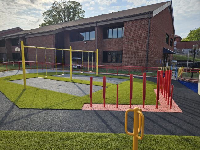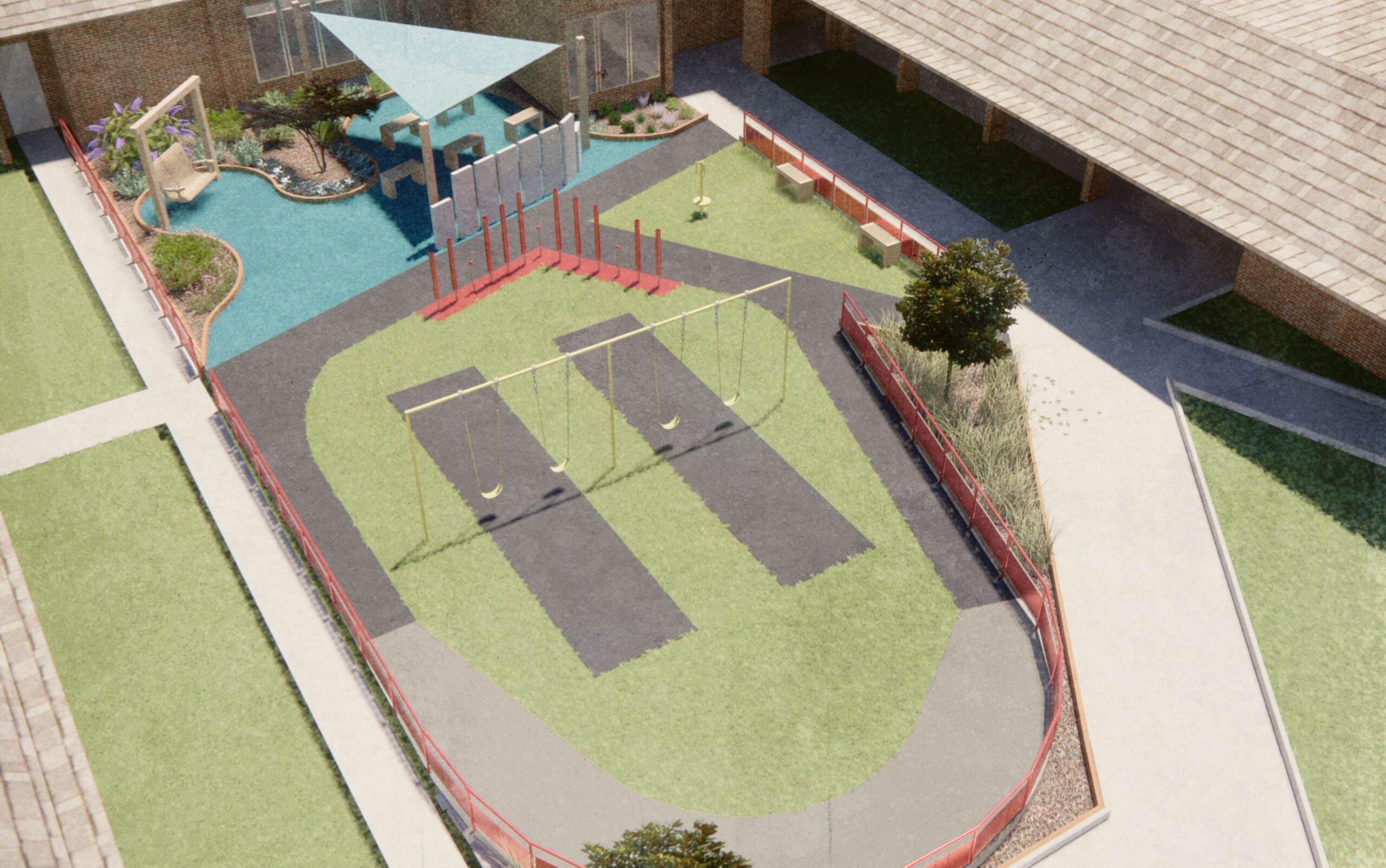 The finished space incorporates durable, low‑maintenance materials selected to support long‑term use while minimizing ongoing repairs for the school. Aromatic plantings, tactile surfaces, an herb garden, accessible seating, and auditory elements help reinforce orientation and sensory learning while contributing to a resilient and welcoming landscape.