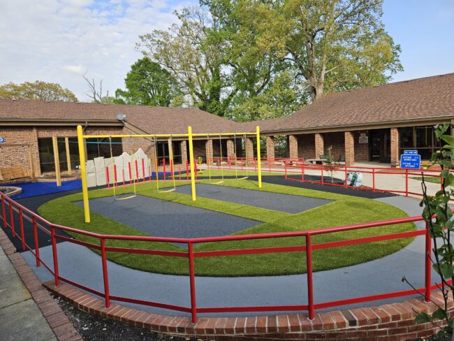 Blue and green turf materials were selected for their anti‑microbial and anti‑static properties to better support wheelchair users. Pour‑in‑place rubber was used along embankments and walkways, including cushioned fall zones beneath the swings. Whisper tubes were created from leftover PVC pipes from other projects, and the chimes were carefully tuned using metal pipes and tactile truncated domes commonly found at street crossings. New swings and a spin station were purchased to ensure safety and long‑term functionality.