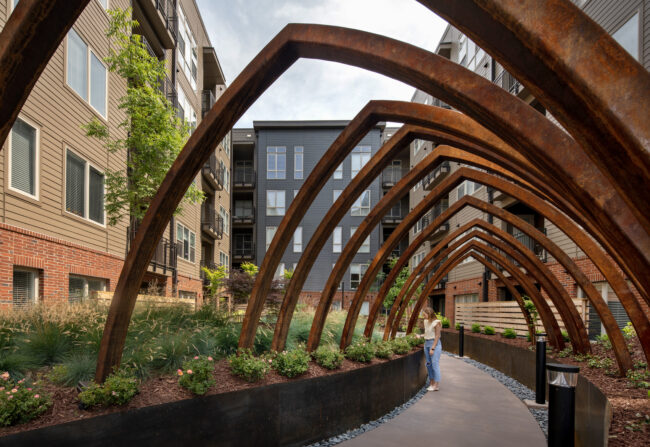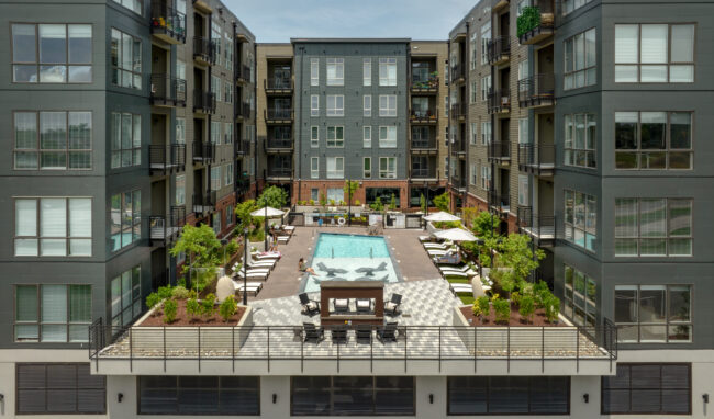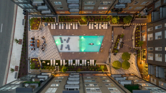 The Ramsey is a 240-unit community designed to create moments of connection and pause within an urban setting. At the center of the project are three courtyards that support wellness, relaxation, and social interaction. The zen garden blends modern materials with natural elements to create a calm, reflective environment, including a meditation labyrinth, open turf for yoga, and quiet seating areas. The pool courtyard serves as a gathering space, anchored by a dual-sided firepit, outdoor cooking and dining areas, swings, and landscaped lounges. Together, these shared spaces help shape a community that feels balanced, intentional, and connected to its surroundings.
