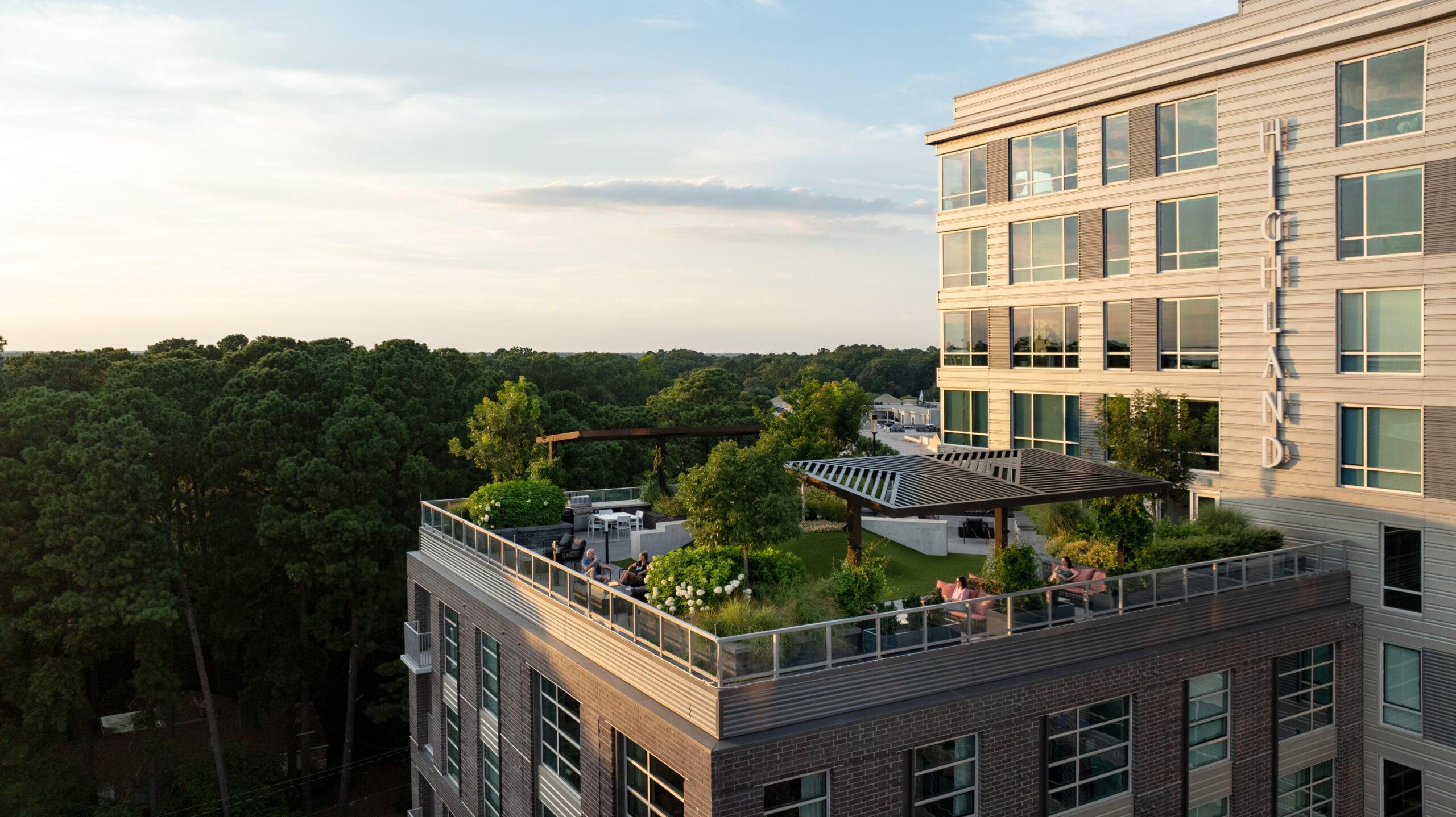 Completed in 2024, Highland North Hills is a 12-story residential tower located in Raleigh’s North Hills Innovation District. It’s a project that blends urban energy with moments of calm, and the landscape architecture plays a central role in that balance.