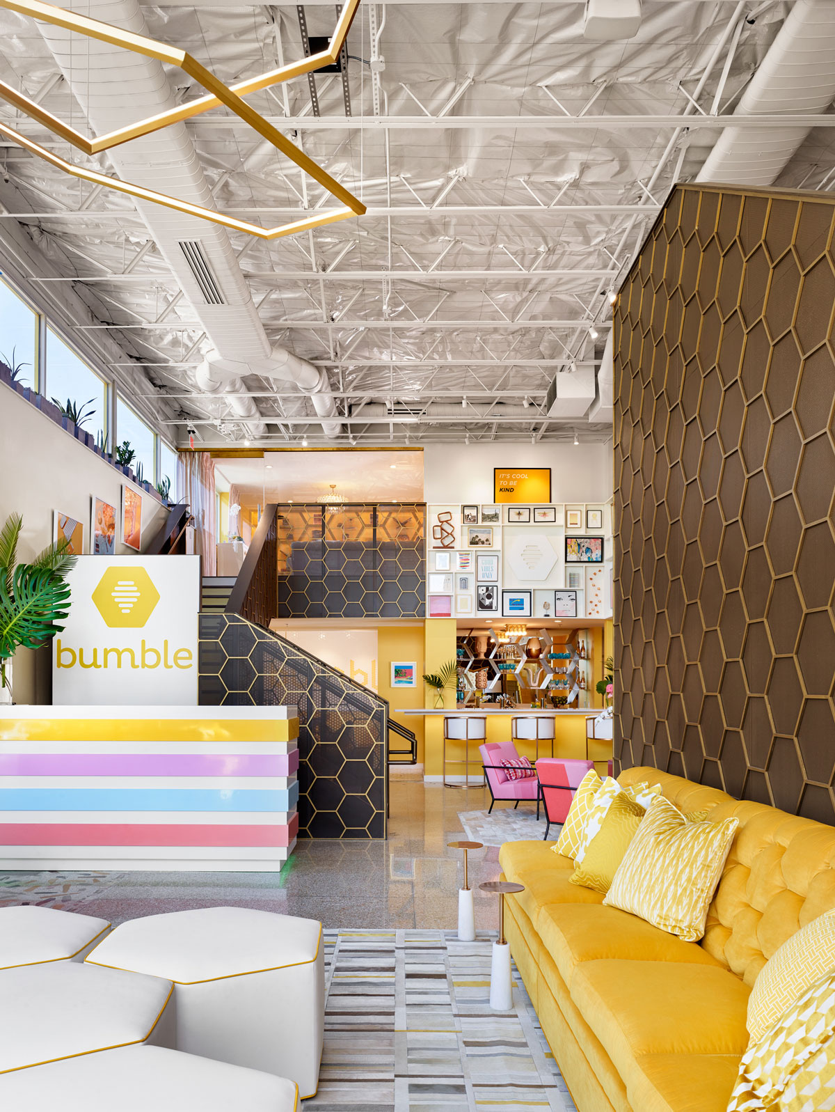 When Whitney Wolfe Herd and her team at Bumble were looking for an architect to make their vision come to life in the space, it was a natural fit, already knowing the space and proving he could think creatively to imagine a space like none other. Drawing inspiration from photos provided by Bumble and the interior design team at JEI Design, Inc., the architects made visions of hexagon wall coverings and a lifestyle-focused environment a reality.