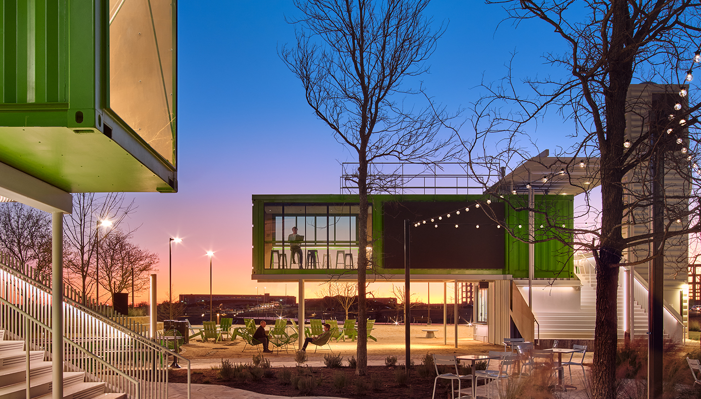 The promenade is sprinkled with groupings of 1-2 story retail blocks, creating a sequence of experiences that maintains a consistent theme through start, middle, and end. Programmatically, retail shells are built out of shipping containers to accommodate the concept of flexible rotation between patrons acting as an incubator of ideas with mixed programming.